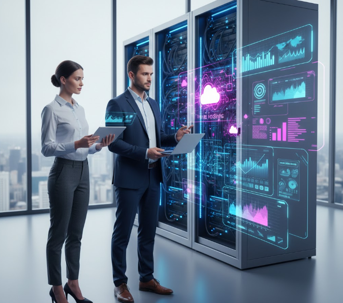 • 1–2 professionals (male/female) interacting with a holographic pricing dashboard or digital interface, analyzing hosting plans
