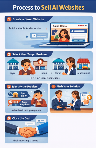 The most direct way of earning is by selling AI websites to local businesses. You create a professional AI-powered website and sell it to salons, clinics, gyms, coaching centers, or restaurants.