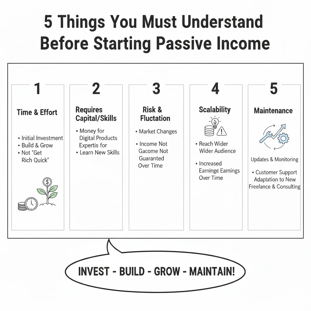 The truth is that building passive income requires the most effort in the initial phase. Whether you write a blog, start a YouTube channel, create a digital product, or invest—everywhere you first need to learn, understand, and build a complete system before anything starts working.