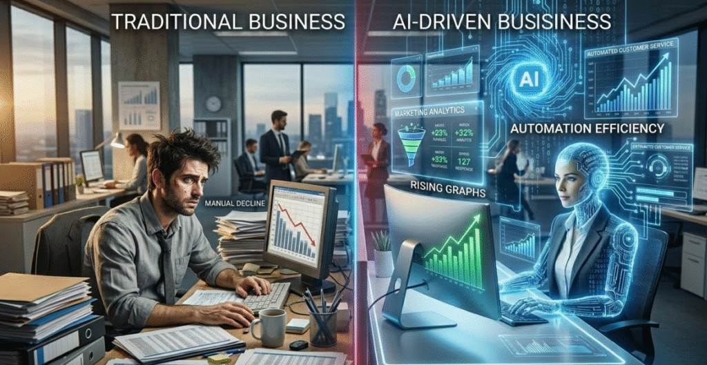 The gap between traditional business operations and AI-powered organizations is becoming increasingly noticeable. Companies that rely entirely on manual processes often struggle to keep pace with competitors that use intelligent automation.